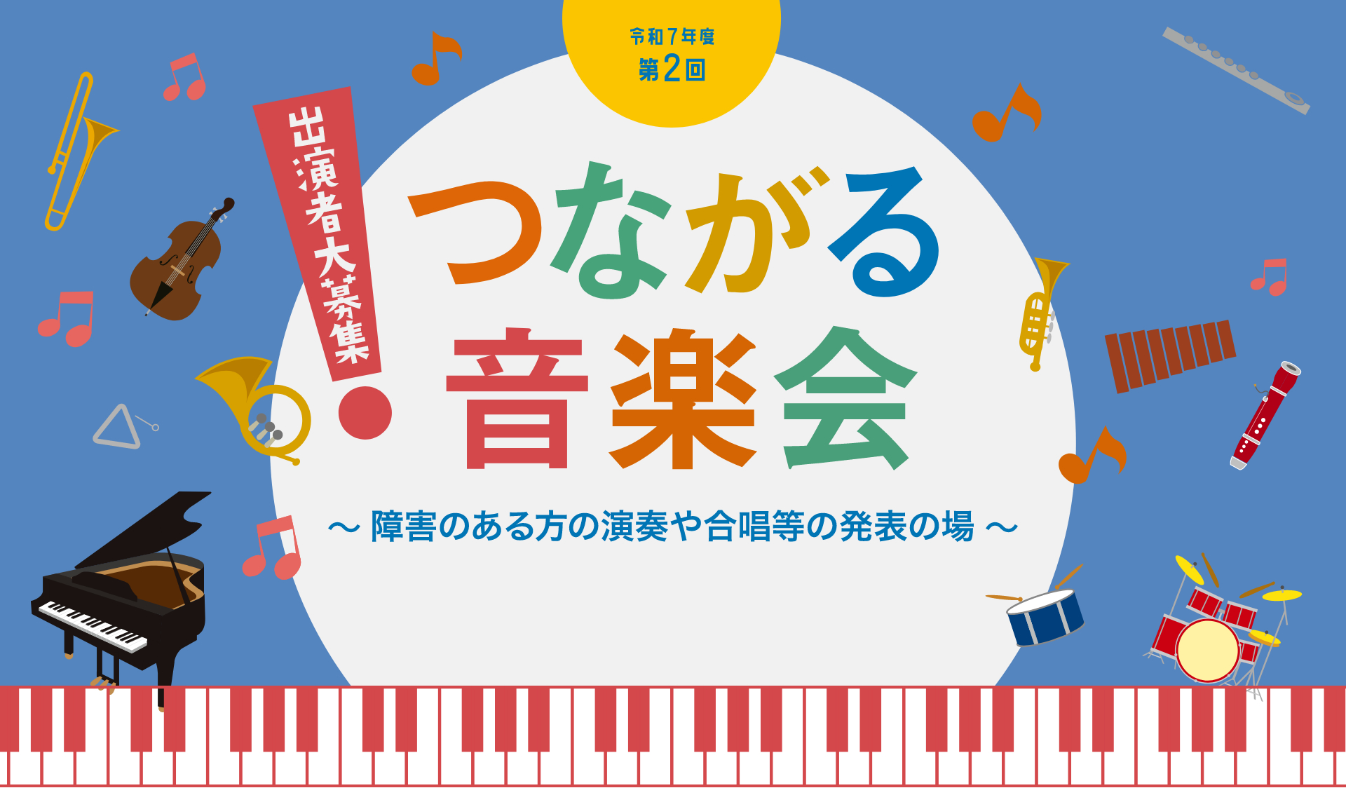 令和7年度第2回つながる音楽会のホームページ。障害のある方の演奏や合唱等の発表の場です。障害者の文化芸術活動の発表の場提供事業とは障害のある方の実演芸術分野にお…