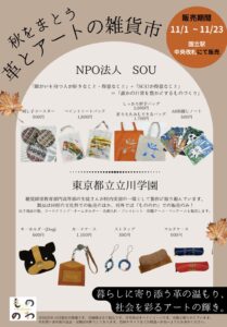 11月1日(土)から、国立駅有人改札で「もののわ」が始まりました! NPO法人SOUからは ◎刺し子コースター ◎ペイントトートバッグ ◎パンダバッグ ◎和綴じノートを出品いたします。 期間:11月1日(土)〜11月23 […]